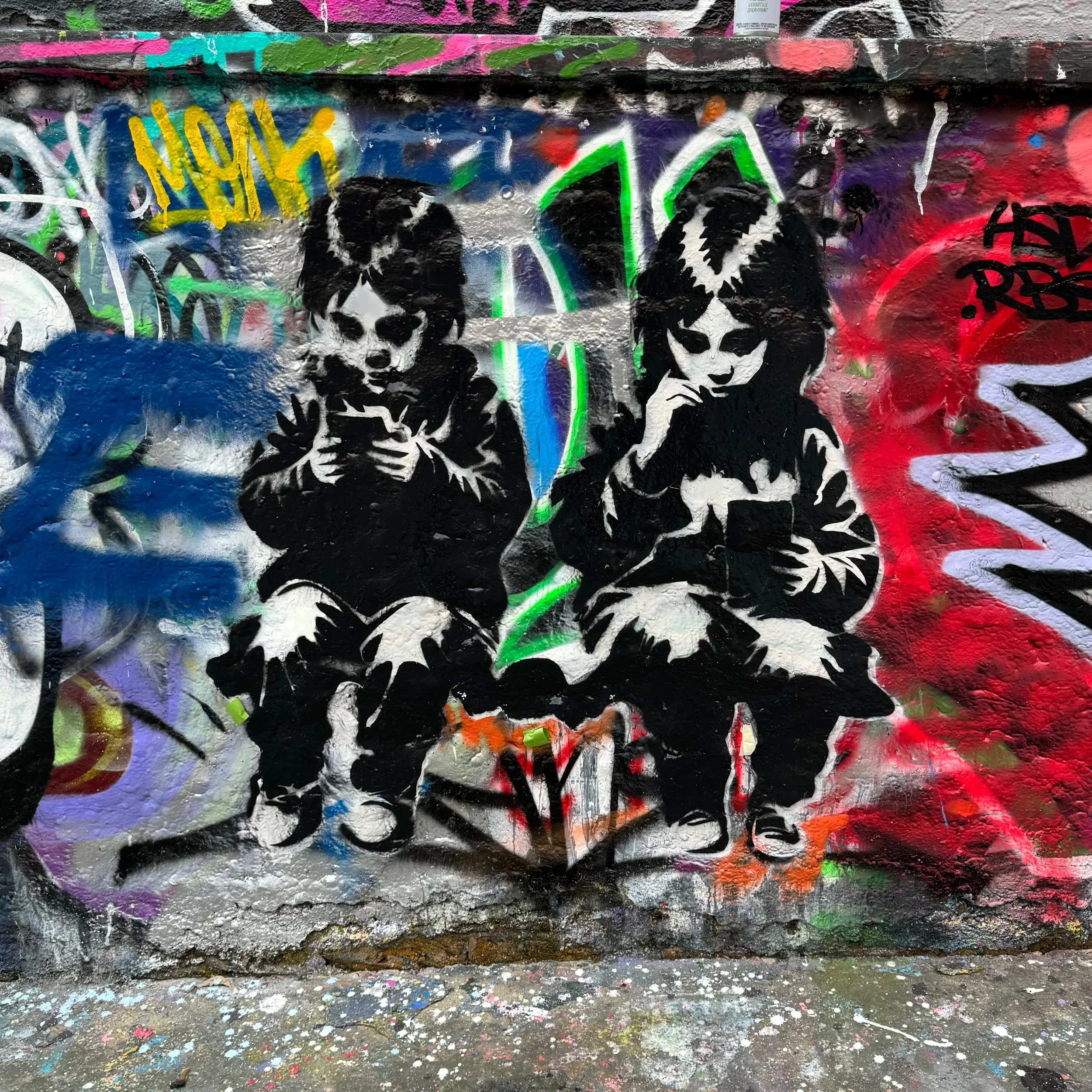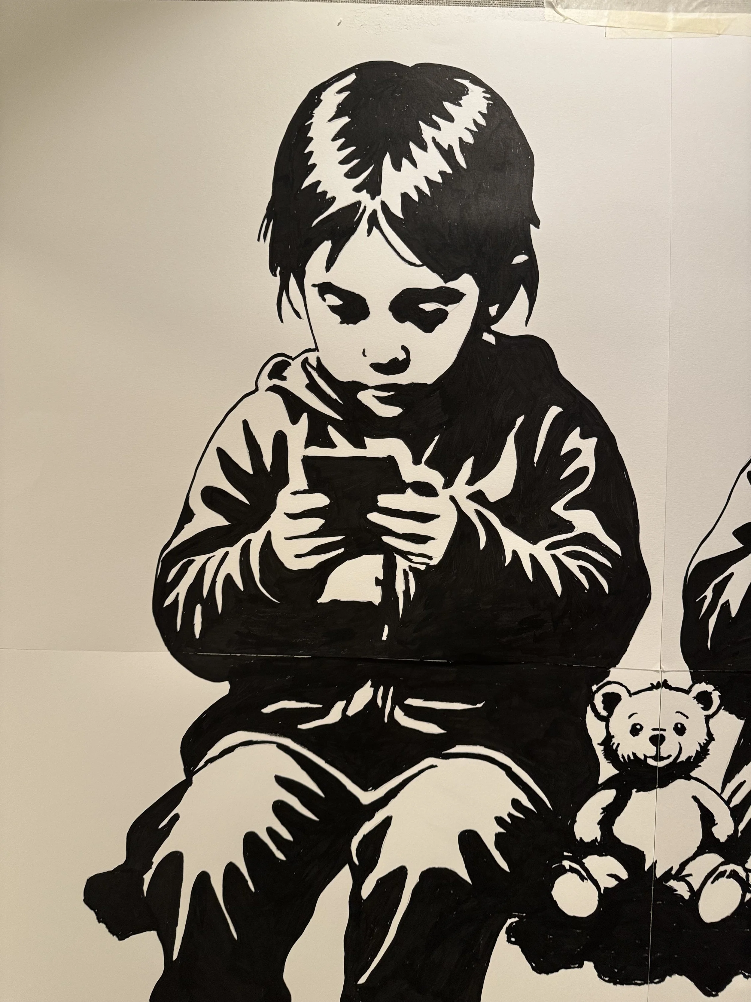 Looking back, I see this piece as a milestone. Though conceived as a studio experiment, it marked both a technical breakthrough, my adoption of stencilling as a core method, and a conceptual refinement of my mission: to raise awareness of how technology is reshaping childhood and mental well-being.